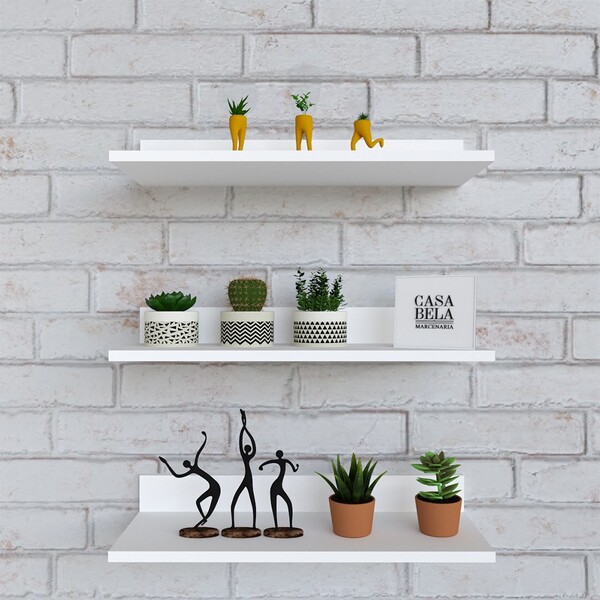 A nossa linha de móveis não para de crescer! E agora traz para você, este lindo kit de prateleira flutuante, ideal para organizar e enfeitar diversos ambientes! Com o seu design neutro, é muito fácil de combinar a variados estilos,  se encaixando na composição de diversas partes da casa. Aproveite sua versatilidade e use-o de acordo com sua necessidade e imaginação para decorar e deixar o seu lar ainda mais aconchegante e bonita! Expecificações: produto na cor branco fosco em mdf 100%. A composição do material é feita por fibra de madeira de pinus e eucalipto com acabamento em resina sintética. A espessura da placa é de 15 mm, ou 1,5 cm.fita de bordo de pvc, mais resistente que pintura. Observações: o produto vem com um kit para instalação. Valor referente a 3 unidade. Objetos decorativos não acompanham. Medidas: 18,5 cm profundidade x54 cm largura. Em caso de dúvidas, verifique o desenho com medidas na última imagem.