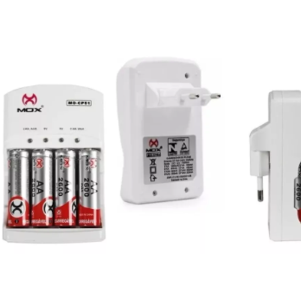 FRETE GRÁTIS PARA TODO BRASIL, ENVIO IMEDIATO - Carregador mox com 4 pilhas recarregáveis aa 2600 mah - 4 Pilhas Recarregáveis Aa 2600 Mah Com Carregador carregador marca: mox modelo: cp-51 acompanha 4 pilhas recarregáveis tipo: aa 2600 mah este carregador é compativel com pilhas aa, aaa e v9, bivolt automático. Possui led azul indicando o processo de carga e função auto stop que desliga automaticamente quando a carga estiver completa. Conta com 3 canais de carga independentes e plug articulado. características do produto:aviso sobre o produto: imagem ilustrativa.tipo: carregadores de pilhas.entrada: ac 100-240v 50/60hz 80ma.saída: dc1.2v - 400ma (aa/aaa). (aa e aaa)200ma1 | (aa e aaa) 200ma2. Dc 9v - 20ma.material: plástico, metal e circuito eletrônico.   acompanha na embalagem:1 carregador de pilhas mod. Mo-cp514 pilhas aa recarregáveis dimensões do produto:  l:10 x a:30 x c:15 cm - peso: 0,400 kg