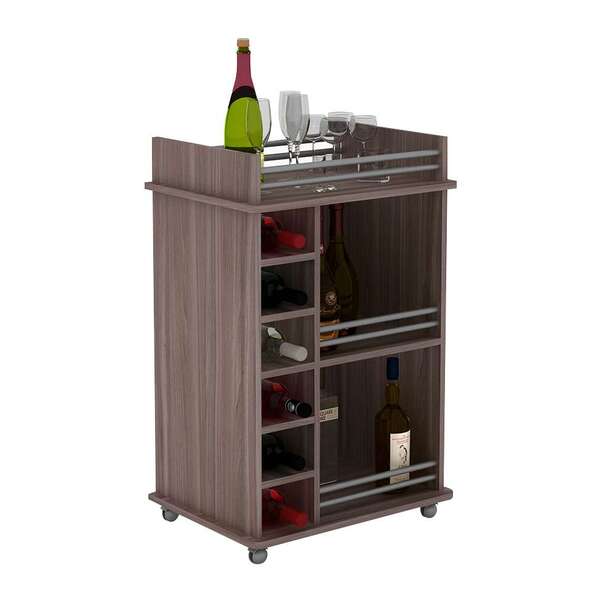Que tal a adega algarves?quem gosta de confraternizar sabe o quanto é importante poder contar com móveis que facilitem o bem-estar dos convidados e garantam um funcionamento fluido do evento. A adega algarves é perfeita pois vem equipada com dois nichos onde você pode apoiar copos, taças, coqueteleiras e outros utensílios para ajudar no preparo das bebidas, além de 6 compartimentos para garrafas e um tampo para os itens que você quer deixar de fácil alcance. De quebra, as barras verticais evitam que os objetos tombem durante a movimentação, que fica muito mais prática graças aos rodízios - desse jeito, você pode levá-la para onde está a festa! Para completar, a estrutura compacta e a cor marrom são simples de inserir no ambiente e fazem dessa peça a opção ideal para quem quer dividir bons momentos com pessoas especiais sem deixar de lado o bom gosto.