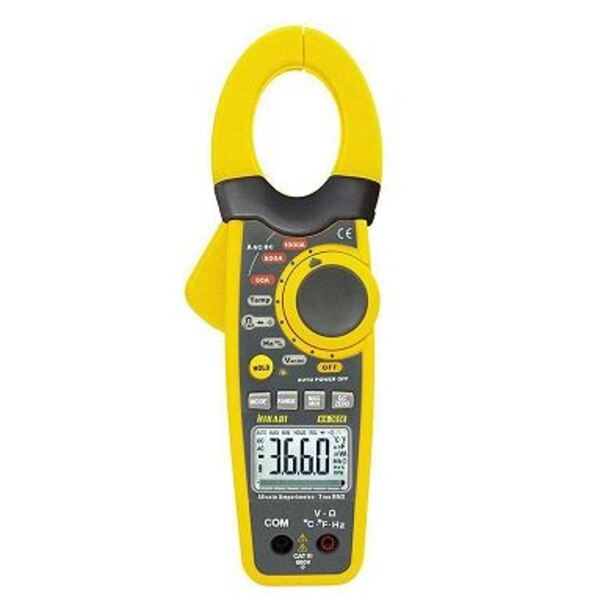 Instrumento digital portátil com mudança de faixa automático, de acordo com a categoria III 600V de segurança, LCD de 3 ½ dígitos com luminação, congelamento de leitura, registro máximo e desligamento automático, realiza medidas de tensão DC e AC, corrente AC, resistência e testes de diodo, continuidade.