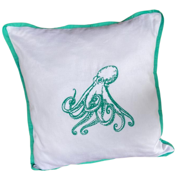 Almofada em sarja na cor branca com bordado do desenho de um polvo na cor azul celeste e viés azul celeste. Zíper na lateral, forro em algodão crú e enchimento de poliéster.