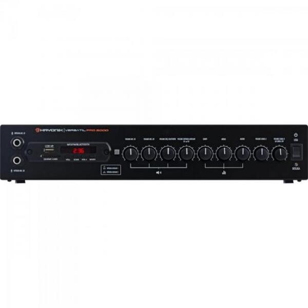 O amplificador hayonik pro2000 é o modelo ideal para quem busca solução de qualidade de sonorização em qualquer ambiente. Agora, além de permitir a mixagem de várias fontes musicais, conta com a nova placa usb/fm/bluetooth que vai tocar suas músicas e gravações direto do aparelho celular, sem a necessidade de conexões com o computador ou aparelho de som. equalização:grave, médio, agudo, volume mic, volume aux, volume usb/bluetoothalimentação:bivolt automáticopeso:2,6 kgconsumo de energia:280va (máximo)classe:abpotência:200w rmsimpedância:4 ohms ou 70v (chave seletora)entradas:p10, rcasaídas:bornes 4 ohms e 70vdimensões:380 x 70 x 230mmthd:0,01%pesquisa:amplificador|200|w|versatil|pro|2000|preto|hayonik|pro2000|pro-2000| • modos: usb, sd, bluetooth, fm • tensão de rede: 127/220 – vac 60hz • controle remoto: sim • sensibilidade: microfone/guitarra 15mv • auxiliar 250mv conteúdo da embalagem: • 01 amplificador pro 2000 • 01 manual do proprietário e o certificado de garantia • 01 controle remoto • 01 bateria para controle remoto