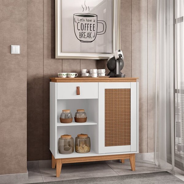 Aparador café rubi . O aparador café rubi chegou para proporcionar ao consumidor, diferencial! Flexibilidade no uso, ele permite ser usado para dividir ambientes. Inovador e com design vintage, ele chegou proporcionando qualidade e conforto para o consumidor, cheio de estilo, compacto e com design moderno, ele facilitará sua organização embelezando ainda mais sua espaço! Porta moldurada com exclusiva pintura 3d palhinha, e com sistema push-open(fecho-toque). Contém 1 gaveta com amplo espaço com corrediças telescópicas e puxador de alça de couro ecológico. Pés em madeira maciça com feltro, acabamento envernizado. Bandeja: não peso (kg): 18.8 garantia: 03 meses altura (cm): 94 acabamento: pintura uv largura (cm): 80 possui adega: não possui vidro: não tipo de porta: bater altura dos pés: 22 pés reguláveis: não possui rodízio: não possui espelhos: não profundidade (cm): 38.5 escala de brilho: semi-brilho gaveta com chave: não material dos pés: madeira maciça serviço montagem: 114259443 material da porta: mdf/mdp origem do produto: nacional acabamento dos pés: verniz ambiente principal: sala de estar material da gaveta: mdf/mdp material principal: mdf/mdp resistente à chuva: não acabamento da porta: pintura uv sapatas niveladoras: não acabamento da gaveta: pintura uv material da prateleira: mdp acabamento da prateleira: pintura uv escala de brilho da porta: semi-fosco tipo de puxador da gaveta: externo escala de brilho da gaveta: semi-fosco tipo de corrediça da gaveta: metálica telescópica material do puxador da gaveta: couro tipo de dobradiça/corrediça da porta: metálica fabricante: casa d marca: casa d cor: branco/noce cor predominante: branco linha ou coleção: versátile 2022 quantidade de portas: 1 porta quantidade de gavetas: 01 gaveta