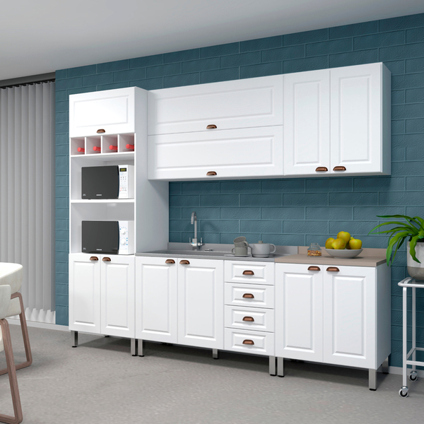 Armário de Cozinha Compacto MDP Branco Balcão Torre e Armário Aéreo 270x220cm Cristal Luciane