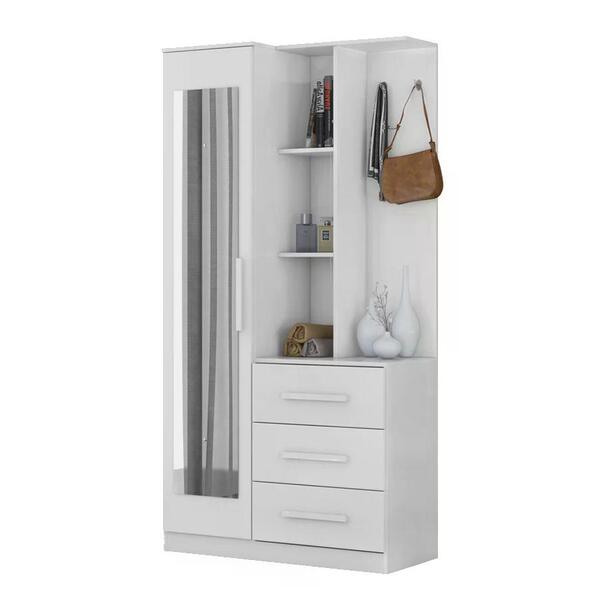 Armário multiuso brisa, ideal para sempre manter a organização da sua lavanderia, auxilia na hora de guardar produtos de limpeza, roupas e tudo o que você precisar. Estrutura reforçada em 100% mdp, contando com acabamento em pintura uv. Composto por 01 porta de bater com dobradiça metálica, um espelho fixado na porta, 03 gavetas externas com corrediças metálicas, puxadores em mdf, prateleiras internas e externas, gancho para pendurar roupas, e nichos para acomodar objetos decorativos. Esse móvel chegará em sua casa separado em 02 volumes.dimensõesaltura 182 cmlargura 94 cmprofundidade 41 cmsistema de montagem parafusos e cavilhas.recomendação de limpezalimpar com pano seco para retirar o pó. Não utilizar produtos abrasivos.*não acompanha puff.importante saberas imagens são meramente ilustrativas não acompanhando objetos de enfeites e eletros ao receber o produto verifique as condições da embalagem, havendo alguma avaria entre em contato conosco para orientações confira as dimensões do produto e certifique-se de que passarão normalmente por supostos elevadores, portas, escadas ou corredores de sua moradia entregamos os produtos até a frente de sua moradia, ou seja, até sua porta se for casa ou portaria se for apartamento. A loja não disponibiliza o serviço de montagem, a montagem é de total responsabilidade do comprador, pois todos os produtos contém manual de montagem, detalhando todas as peças. Recomendamos que a montagem seja feita por um profissional da área.garantia de fábrica3 meses para eventuais defeitos de fabricação.