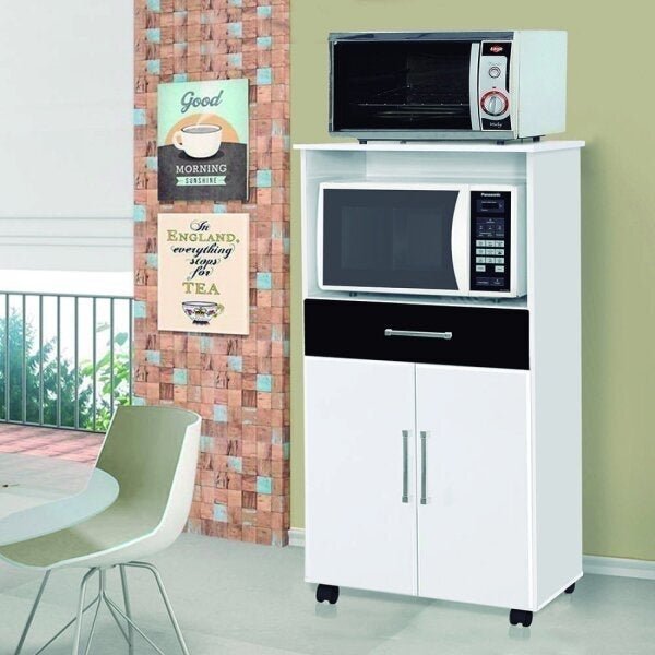 Balcão ipê móveis primus branco/preto. O balcão é fabricado com materiais de qualidade, ele possui espaço para forno e micro-ondas, 2 portas, 1 gaveta e prateleiras espaçosas para deixar os seus pertences arrumados e sempre à mão, possui rodizio para melhor locomoção e facili...