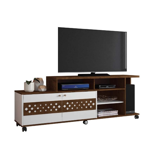 Descrição do produto:amplo espaço para aparelhos eletrônicos e objetos decorativos; 6 rodízios cromados de 50 mm facilitando a movimentação; 2 portas com dobradiças laterais e apliques decorativos com corte a laser; puxadores pontuais com acabamento champanhe; prateleira inferior removível; estrutura em mdp e mdf de 25mm e 15mm.  instruções, avisos, cuidados por produto: limpeza com pano macio levemente umedecido em água. especificações técnicas:material:mdp de 25mm e 15mm; portas em mdf 15mm. Largura: 160 cmaltura: 63 cmprofundidade: 40 cmpeso bruto (kg): 33,2 kgespaço para tv: 47"qde de portas:2qde de gavetas: 0 qde de prateleiras: 1estrutura das prateleiras: mdf 15mmpuxadores (material): puxador em poliestireno com acabamento metálico foscodobradiças (tipo/ material): dobradiças caneco / metalvolumes: 1acabamento(s): peças na cor canyon com acabamento em impressão uv texturizada e peças brancas em impressão uv alto brilho.escala de brilho: fosco / brilhante  montagem do produto:produto necessita montagem.sistema de montagem: girofix, cavilhas e parafusos.complexidade da montagem: médiamaterial do tampo (espessura): mdp 25mm   o produto é entregue desmontado.recomendamos auxílio de um profissional para montagem do produto.
