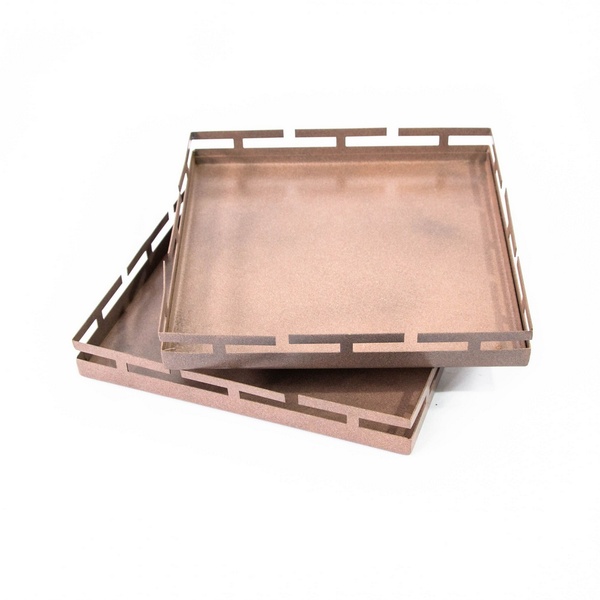 Resistente e utilitária nossa bandeja pode ser usada de inúmeras formas como por exemplo apoio para copos e taças e até mesmo para servir algum tipo de alimento em suas comemorações a cortes cores é especialista em transformar aço em arte! Todas as nossas peças são fabricadas em aço galvanizado com pintura eletrostática  o que torna nossos produtos extremamente duradouros. especificações:  material: aço galvanizado altura: 4cm  largura: 30cm comprimento: 30cm   peso: 1040g cores: preto fosco marrom fosco importante: - podem ocorrer variações na cor do produto conforme o contraste e brilho do monitor luminosidade local ou percepção visual. - imagens ambientadas são meramente ilustrativas os objetos e demais móveis não acompanham o produto.