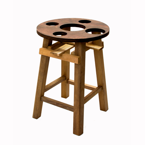 Banqueta baixa em madeira, também funciona como mesa porta-copo e porta-garrafa.