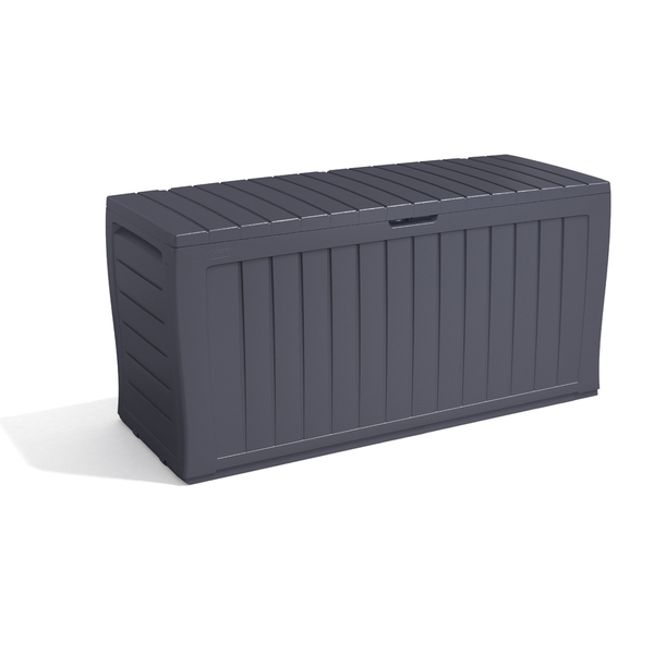 O baú de plástico modelo Marvel 270L da Keter oferece uma solução contemporânea de armazenamento para seu espaço ao ar livre. Feito de resina durável e resistente ao clima severo, é ideal para manter suas almofadas, brinquedos e acessórios de piscina ou churrasco ventilados e secos. Disponível na cor grafite, a textura imita ripas de madeira que combinam com diversos tipos de móveis, e acomoda dois adultos confortavelmente, sobre sua tampa que suporta até 220 kg distribuídos sobre ela.