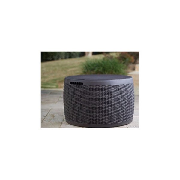 Armazenamento assentos e uma mesa lateral. Peça que é uma mesa lateral mas também fornece 140l / 37 g de armazenamento e ainda pode ser usada como assento por um adulto. Podendo ser usada em ambientes internos e externos pois é feita a partir de uma resina resistente a variações climáticas. Sofisticação através da textura em estilo rattan e alças embutidas para fácil movimentação e ainda é fácil de montar.