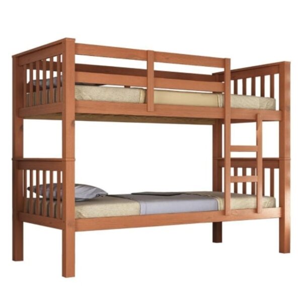 MEDIDAS: [ A ] = 165 cm [ L ] = 92 cm [ P ] = 200 cm PESO SUPORTADO POR CAMA: 100 Kg Características MARCA: PederPinus MODELO: Beliche Madeira Maciça Esmeralda COR: Castanho MATERIAL: Madeira Pinus ACABAMENTO: Acetinado TAMANHO: Para colchões de solteiro 0,88m SISTEMA DE MONTAGEM: Parafusos GARANTIA: 3 Meses DIFERENCIAL: Escada pode ser montada de ambos os lados, camas separadas.