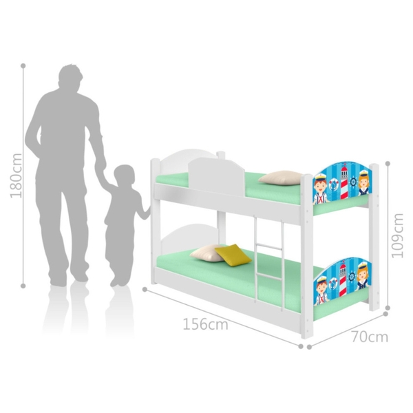 Beliche Juvenil Marinheiros com 2 Colchões Ref- 1436 Agora a hora de dormir das meninas terá mais charme e segurança com a Beliche Juvenil Marinheiros com 2 Colchões A Coleção Marinheiros foi desenvolvida por nossos designers oferecendo um visual exclusivo, descontraído e divertido ao ambiente. Ela vem com escada, grade de proteção lateral na cama superior. Acomoda colchões de 150 x 70 cm que acompanham o produto. Garanta comodidade, qualidade e muita diversão para as noites de sono da garotada. Itens Inclusos Adesivo automotivo, Escada e Grade MDF Kit completo para montagem, manual detalhado de instruções. 2 Colchões D18 (150 cm x 70 cm cada um) Colchão aprovado e com Selo INMETRO. Garantia de segurança e qualidade para a criança!!! Garantia 3 meses contra defeito de fabricação Instruções de Limpeza Limpar com flanela ou pano macio seco, não utilizar produtos abrasivos, álcool ou solvente. Não expor o produto diretamente à luz solar e à umidade. Medidas do Produto Altura- 109 Cm Largura- 70 Cm Comprimento- 156 Cm Colchões D18 (150 cm x 70 cm cada um) Produzido Em Mdf De 15mm * Suporta até 35kg por pessoa em cada cama. * Posição da Escada e da Grade é de acordo com a preferência do cliente durante a montagem. * Sugerimos a contratação de um montador profissional para a montagem do produto. Não nos responsabilizamos por avarias causadas no ato da montagem. * Não nos responsabilizamos pela montagem e desmontagem do produto no ato da entrega e devolução, assim como os custos gerados nestas situações. A transportadora entregará o produto no andar térreo do endereço de entrega. Não nos responsabilizamos por subir escadas, corredores e elevadores ou transporte por guincho em apartamentos. * Imagens meramente ilustrativas * Objetos que compõem o ambiente das fotos não acompanham o produto.