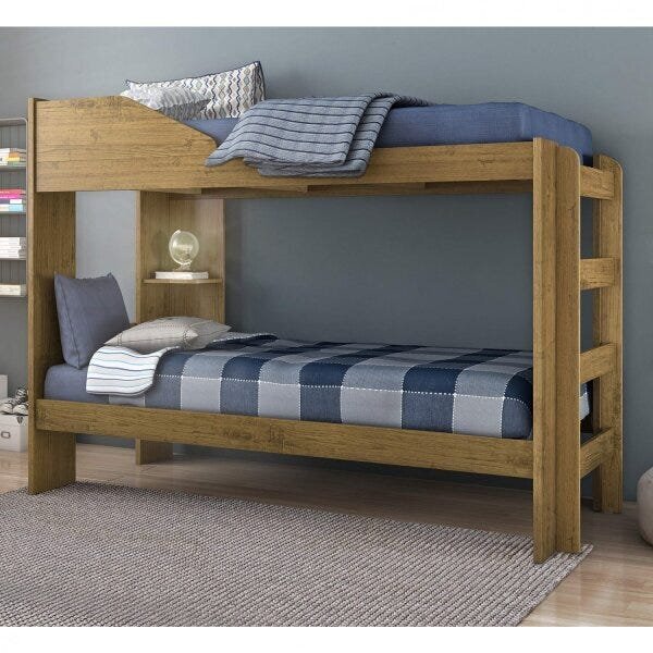 Beliche solteiro indy conquista móveis . Que tal deixar seu ambiente ainda mais bonito e aconchegante?rnrna beliche indy dá um toque todo especial para o seu quarto, com estrutura em mdp e um excelente acabamento de pintura uv, possui travessas reforçadas, travamento nos pés para maior segurança e proteção antiquedas na cama superior. Conta com escada lateral e prateleira interna para objetos. Pés reforçados de 25 mm garantindo melhor resistência ao móvel. Estilo: moderno peso (kg): 63 garantia: 03 meses altura (cm): 150 acabamento: pintura uv largura (cm): 203 possui pés: sim tipo de cama: convencional possui portas: não altura dos pés: 35 comprimento (cm): 97.5 possui gavetas: não possui rodízio: não suporta até (kg): 200 tipo de estrado: fixo escala de brilho: fosco material dos pés: mdf serviço montagem: 114259443 acompanha colchão: não material da porta: mdp origem do produto: nacional ambiente principal: quarto material da escada: mdf material da gaveta: mdf possui prateleiras: sim tamanho do colchão: solteiro material do estrado: pinus possui escrivaninha: não sapatas niveladoras: não material da prateleira: mdf acompanha cama auxiliar: não acabamento da prateleira: pintura texturizada uv possui trava de segurança: sim peso máximo por prateleira: 3 altura do estrado até o chão: 33.6 peso suportado por cada cama: 100 escala de brilho da prateleira: fosco altura do estrado superior até o chão: 123.8 permite a utilização de cama auxiliar: não fabricante: conquista móveis marca: conquista móveis cor: carvalho rústico itens inclusos: 1 cama e manual de montagem. Cor predominante: marrom linha ou coleção: indy tamanho do colchão indicado (l x c): 88cm x 188cm