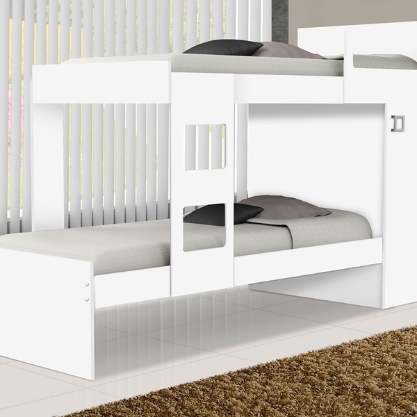 Beliche solteiro vitoria branco beliche solteiro vitoria é perfeita para economizar espaço e ainda fornecer conforto e qualidade na hora do descanso e recuperar as energias. é a combinação de resistência e beleza em um móvel só, feita em mdf possui escada e ótimo acabamento...
