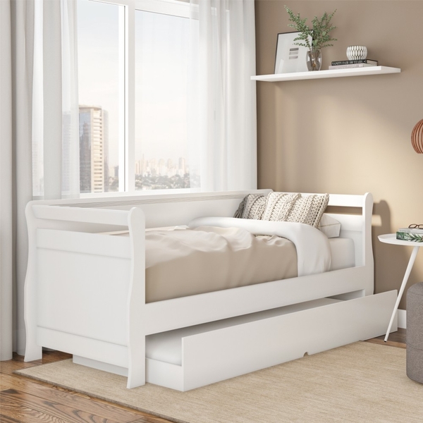 A bicama é belíssima e conta com um design funcional, que ocupa pouco espaço no ambiente. a cama auxiliar fica embaixo da principal e basta puxá-la por meio das corrediças para começar a fazer uso dela. é ideal para quartos pequenos e para caso precise de uma cama extra para receber um amigo, ou divida o dormitório com alguém. cama principal e auxiliar ideal para colchão de solteiro com 78 cm de largura. (não incluso). dimensões da cama montada: altura: 84 cm largura: 210 cm comprimento: 84 cm informações do produto: cama principal utilizar colchão 78 cm na altura desejada. (colchão não incluso) cama auxiliar utilizar colchão 78 cm, na altura máxima de 14 cm. (colchão não incluso) cama auxiliar com rodízios para melhor locomoção. estrado reforçado. material: mdf/mdp tipo de cama: solteiro suporta até 100kg tipo de cama: bicama acompanha colchão: não. cor principal: branco escala de brilho: semi brilho estampado: não. tema: não. itens inclusos: 01 bicama kit completo para montagem, manual de instruções. garantia: 3 meses contra defeito de fabricação. informações complementares: - fotos meramente ilustrativas do produto no ambiente. - objetos que compõem o ambiente das fotos não acompanham o produto. - verificar descrição e tamanho do produto antes da compra. - avaliar a mercadoria no ato do recebimento e recusar em caso de divergência ou avarias. - mantenha as informações de contato e endereço de entrega atualizados para entrarmos em contato caso necessário. * sugerimos a contratação de um montador profissional para a montagem do produto. Não nos responsabilizamos por avarias causadas no ato da montagem. * não nos responsabilizamos pela montagem e desmontagem do produto no ato da entrega e devolução, assim como os custos gerados nestas situações. * a transportadora entregará o produto no andar térreo do endereço de entrega. * não nos responsabilizamos por subir escadas, corredores e elevadores ou transporte por guincho em apartamentos.