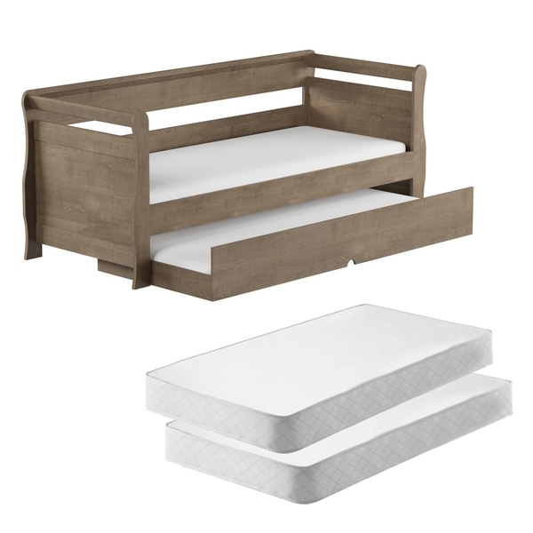 A bicama é belíssima e conta com um design funcional, que ocupa pouco espaço no ambiente.a cama auxiliar fica embaixo da principal e basta puxá-la por meio das corrediças para começar a fazer uso dela.é ideal para quartos pequenos e para caso precise de uma cama extra para receber um amigo, ou divida o dormitório com alguém.cama principal e auxiliar ideal para colchão de solteiro com 78 cm de largura. Acompanha 2 colchões 14x78x188 dimensões da cama montada:altura: 84 cmlargura: 210 cmcomprimento: 84 cminformações do produto:cama principal utilizar colchão 78 cm na altura desejada. (colchão incluso)cama auxiliar utilizar colchão 78 cm, na altura máxima de 14 cm. (colchão incluso)cama auxiliar com rodízios para melhor locomoção.estrado reforçado.material: mdf/mdptipo de cama: solteirocolchão: sim (2 colchões de 14x78x188 )suporta até 100kgtipo de cama: bicamaacompanha colchão: não.cor principal: carvalhoescala de brilho: semi brilhoestampado: não.tema: não.itens inclusos:01 bicama02 colchões kit completo para montagem, manual de instruções.garantia:3 meses contra defeito de fabricação.informações complementares:- fotos meramente ilustrativas do produto no ambiente.- objetos que compõem o ambiente das fotos não acompanham o produto.- verificar descrição e tamanho do produto antes da compra.- avaliar a mercadoria no ato do recebimento e recusar em caso de divergência ou avarias.- mantenha as informações de contato e endereço de entrega atualizados para entrarmos em contato caso necessário.* sugerimos a contratação de um montador profissional para a montagem do produto. Não nos responsabilizamos por avarias causadas no ato da montagem.* não nos responsabilizamos pela montagem e desmontagem do produto no ato da entrega e devolução, assim como os custos gerados nestas situações.* a transportadora entregará o produto no andar térreo do endereço de entrega.* não nos responsabilizamos por subir escadas, corredores e elevadores ou transporte por guincho em apartamentos.