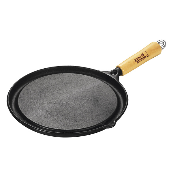 Chapa bifeteira de ferro fundido redonda lisa mede 24 5 cm de diâmetro marca panela mineira. Possui cabo de madeira canaletas para colher líquidos e manter o centro mais aquecido. deve ser utilizada diretamente sobre a chama do fogão a gás a lenha elétrico. Ideal para p...