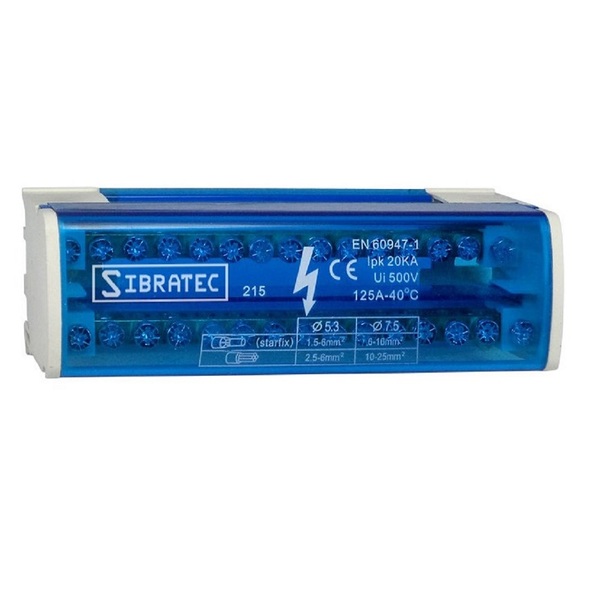 Bloco de distribuição 2 barramentos x 15 ligações. Corrente máxima 125a; -fixação: montagem em trilho din / parafusado; -tensão máxima de isolação: 500vca; -corrente de curto circuito: 20ka; -grau de proteção: ip20;  -material isolante: nylon pa6.6.