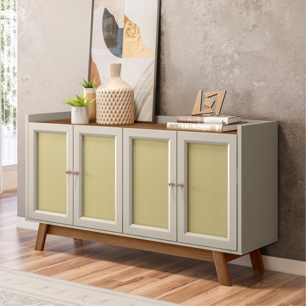 O buffet vai encantar o seu ambiente com a sua elegância! contém porta de abrir com tela em estilo rattan, pés em estilo retrô, puxador na cor cobre. produto em mdp/mdf. acompanha 1 pé de apoio, opcional na montagem. dimensões do produto: altura: 88 cm largura: 160 cm