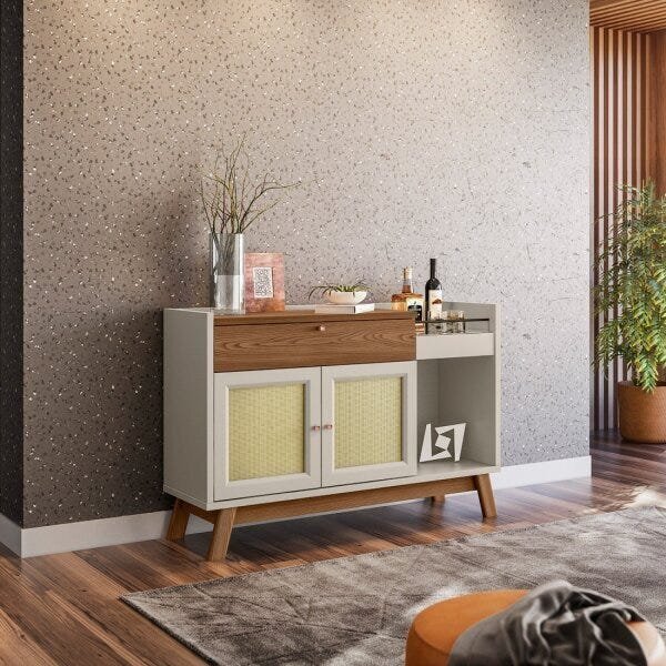 Buffet piemonte freijó/off white. O buffet piemonte veio para inovar. Com detalhes únicos, que trarão ainda mais elegância ao seu ambiente! Possui uma gaveta com corrediças telescópicas que lhe possibilita guardar seus objetos que não precisam ficar à mostra. Conta também com duas portas de abrir com detalhes em fibra natural e um porta bebidas com haste metálica e espelho, proporcionando ainda mais sofisticação! Estilo: retrô bandeja: não peso (kg): 40.03 garantia: 03 meses altura (cm): 87 acabamento: pintura uv largura (cm): 133 peso bruto (kg): 43.03 possui pés: sim possui adega: não possui vidro: não possui portas: sim tipo de porta: bater altura dos pés: 18 pés reguláveis: não possui gavetas: sim possui rodízio: não possui espelhos: sim profundidade (cm): 38 escala de brilho: fosco gaveta com chave: não material dos pés: mdf serviço montagem: 114259443 material da porta: mdf origem do produto: nacional ambiente principal: sala de jantar formato do espelho: retangular material da gaveta: mdp material principal: mdf/mdp possui prateleiras: não acabamento da porta: pintura uv quantidade de itens: 1 sapatas niveladoras: não acabamento da gaveta: pintura uv peso máximo por gaveta: 5 quantidade de espelhos: 1 tipo de puxador da porta: externo escala de brilho da porta: fosco tipo de puxador da gaveta: externo escala de brilho da gaveta: fosco tipo de corrediça da gaveta: metálica telescópica material do puxador da porta: plástico tipo de dobradiça/corrediça da porta: metálica fabricante: linea brasil marca: linea brasil cor flex: não tonalidade: off white / marrom cor do produto: freijó/off white itens inclusos: 1 buffet, kit ferragens e manual de montagem cor predominante: amarelo quantidade de prateleiras: não possui quantidade de portas: 2 portas quantidade de gavetas: 01 gaveta