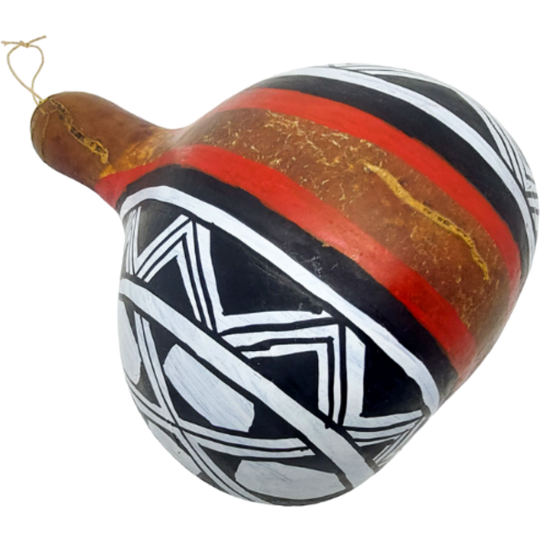 História: Os Mehinako são um povo de língua aruak, habitante do Parque Indígena do Xingú, que abriga povos de línguas diversas. Pertencem, assim, a um amplo complexo multiétnico cujos habitantes compartilham não apenas o território, mas também diversas práticas culturais, celebrando rituais em conjunto, casando entre si, trocando alimentos e objetos. Excelentes artesãos, os Mehinako preservam seus artefatos tradicionais. Cabe aos homens a confecção dos bancos, remos, máscaras e pás de beijú, além da amarração final dos cestos. As mulheres fazem o fio de buriti, as redes, as cuias, os cestos e as esteiras. As cuias são utensílios importantes no dia-a-dia dos povos indígenas: seja para carregar ou armazenar alimentos ou até mesmo fazendo as vezes da colher ou copo, ela é um objeto leve e de diversos formatos e tamanhos. As cuias, também conhecidas como Coité (termo tupi kuya e'tê, que significa "cuia verdadeira"), são o fruto seco de diferentes espécies de árvores da família Bignoniaceae. O povo Mehinako tem por costume adornar as cuias com grafismos tradicionais de seu povo, deixando-as belíssimas. Muito além de ser um simples utensílio, as cabaças mehinako são pura arte e beleza que decoram e trazem a força da floresta para qualquer ambiente!