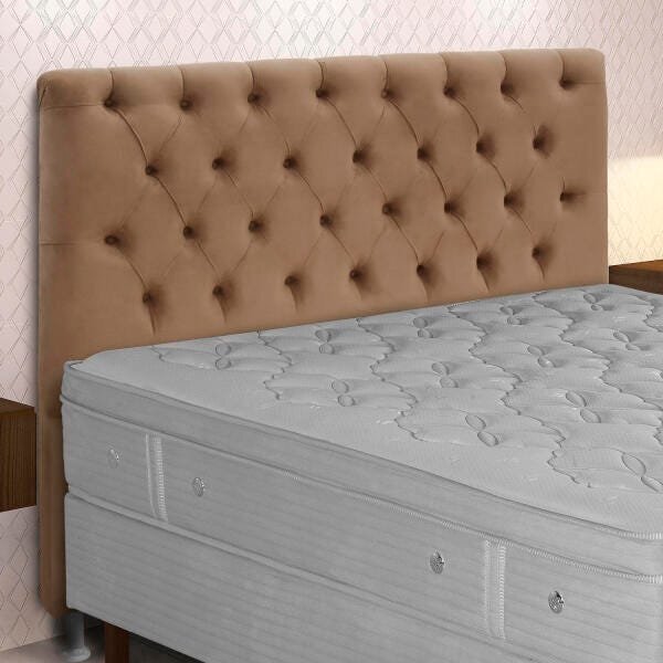 Cabeceira queen estofada embaixatriz bege. A cabeceira embaixatriz simbal, foi desenvolvida utilizando matérias-primas selecionadas. Possui acabamento com botões ou strass que proporcionam elegância ao produto e deixa seu quarto mais bonito. É produzida em madeira de eucalip...