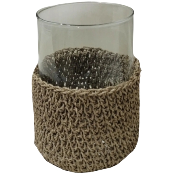 cachepot vaso crochê médio o design misto e versatilidade desse item o tornam uma escolha atraente para quem procura agregar sofisticação e personalidade ao ambiente. Sua estética em crochê e combinação de materiais naturais e sintéticos o tornam adequado para uma variedade de estilos de decoração de rústico a contemporâneo. material: combinação de fibra sintética e fibra natural juntamente com um vaso de vidro. design: este objeto multifuncional é caracterizado pelo trabalho em crochê uma técnica artesanal que adiciona textura e charme à peça. utilização como cachepot: o vaso de vidro incluído permite que você use esta peça como um cachepot perfeito para acomodar pequenas plantas ou flores seja como uma peça central em uma mesa ou para adicionar um toque de verde em qualquer canto da sua casa. utilização como castiçal: a construção do item também permite sua utilização como castiçal tornando-se um elemento acolhedor que pode trazer uma atmosfera aconchegante através da iluminação suave de velas. tamanho: médio