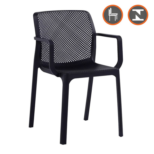 A nossa cadeira sardenha - preta possui certificado do inmetro e além disso  é perfeita para você que procura cadeiras para os ambientes internos e externos. As curvas suaves do assento são modernas e sofisticados e os braços garantem conforto ao usuário. Além de ser de sim...