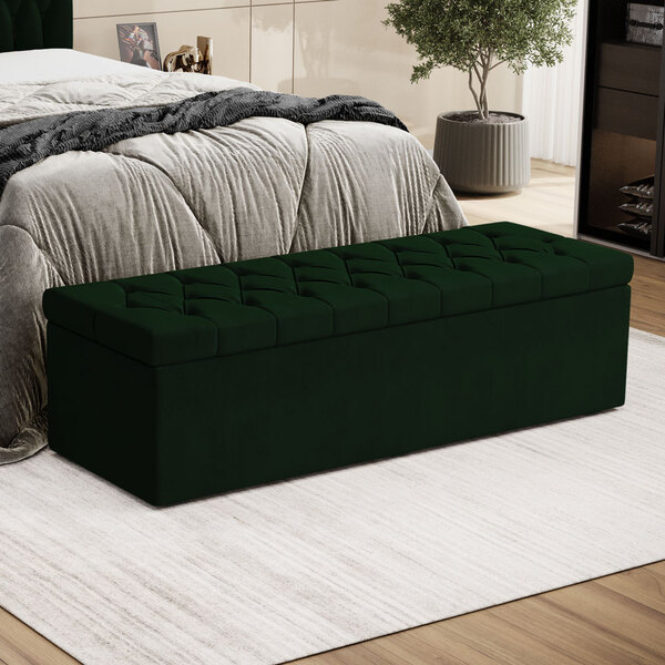 A calçadeira sagitarius irá te impressionar com sua beleza. Com seus detalhes em botões capitonê e seu báu interno, lhe traz todo o conforto necessário, tudo isso com um ótimo custo benefício. Possui ótima capacidade de armazenamento interno, podendo armazenar cobertores, almofadas, entre outros objetos. Adquira já!      dimensões da calçadeira largura: 160 cm altura: 47 cm profundidade: 46 cm peso: 20 kg   dimensões do produto embalado largura: 162 cm altura: 47 cm profundidade: 46 cm peso: 22 kg   características do produto: madeira de eucalipto proveniente de reflorestamento fixação com grampos galvanizados espuma poliuretano d20 revestimento: sued cor: verde tamanho: queen para cama box de 158 cm possui pés: sim tipo de pés: sapatas quantidade de pés: 4 sapatas possui detalhes em capitonê possui baú interno embalagem: plástico bolha, papelão ondulado, malha, plástico garantia de 3 meses contra defeitos de fábrica.   diferenciais:  - madeira de alta qualidade - design moderno - material resistente - ótimo acabamento - estrutura reforçada   sistema de montagem: o produto é enviado montado, sendo necessário apenas a fixação dos frames e pés. Manual de montagem: sim volumes: 1 volume montagem: recomendamos que seja feita por um profissional recomendação de limpeza: utilize pano levemente úmido   observações importantes - produto para uso residencial em ambiente interno, não devendo ficar exposto diretamente ao sol, calor e umidades excessivas. - pode haver alguma diferença de tonalidade entre a imagem e o produto real, por conta do tratamento de imagens e a calibração de cores do seu monitor. - as imagens são meramente ilustrativas, não acompanham objetos de decoração e eletrônicos. - ao receber a mercadoria, o cliente deve verificar as condições da embalagem, caso haja alguma avaria não assine o comprovante de recebimento. - montagem, desmontagem e outras instalações serão de responsabilidade do cliente. Não nos responsabilizamos, no ato da entrega, por subir escadas/elevadores ou pelo transporte por guincho em apartamentos. Eventuais despesas são de responsabilidade do comprador. - confira as dimensões do produto e certifique-se de que passará normalmente por supostos elevadores, portas, escadas e/ou corredores. - em caso de troca ou devolução, o produto deve obrigatoriamente ser embalado novamente com a embalagem original ou semelhante