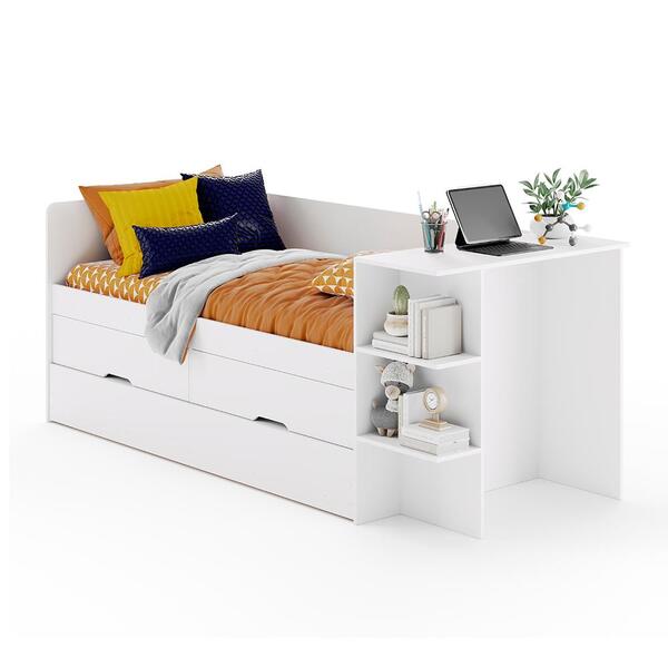 A bibox com escrivaninha é ideal para quem busca praticidade e conforto. Feita em mdf/mdp colchão indicado de 88 x 188 cm , com altura máxima de 14 cm para cama auxiliar. Não acompanha colchão dimensões do produto altura: 90 cm largura: 95 cm comprimento: 232 cm informações complementares: tipo de cama: bicama mesa: sim prateleira: sim (2) gavetas: sim 2 acompanha colchão: não. Material principal: mdf/mdp cor principal: branco peso máximo suportado cama: 90kg itens inclusos: 01 bibox kit completo para montagem, manual de instruções. Garantia: 3 meses contra defeito de fabricação informações complementares: - fotos meramente ilustrativas do produto no ambiente. - verificar descrição e tamanho do produto antes da compra. - avaliar a mercadoria no ato do recebimento e recusar em caso de divergência ou avarias. - mantenha as informações de contato e endereço de entrega atualizados para entrarmos em contato caso necessário. - limpar com flanela ou pano macio seco, não utilizar produtos abrasivos, desengordurantes, álcool ou solvente. Não expor o produto diretamente à luz solar e à umidade. * apesar de fácil montagem, sugerimos a contratação de um montador profissional caso necessário. * antes de comprar seu produto verifique as medidas do produto e do local onde pretende montar. * não nos responsabilizamos pela montagem e desmontagem do produto no ato da entrega e devolução, assim como os custos gerados nestas situações. * a transportadora entregará o produto no andar térreo do endereço de entrega. * objetos que compõem o ambiente das fotos não acompanham o produto.