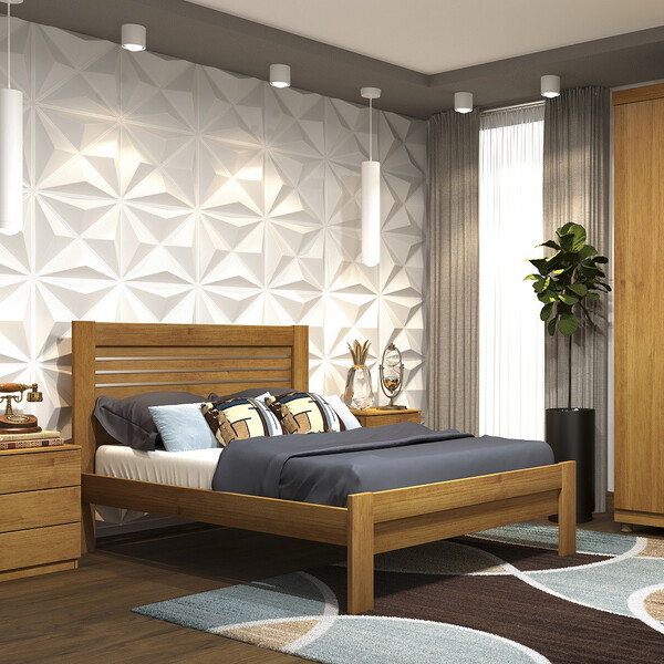 A cama de casal safira da tcil traz uma proposta ousada em sua cabeceira, criando um efeito moderno com a aplicação das peças em diagonal. produzida com material de alta qualidade, possui estrutura em mdf com pintura u.v acetinada e acabamento texturizado e estrado em madeira reflorestada. características: material: mdf cabeceira: com apliques em pvc estrado: madeira reflorestada pintura: u.v acetinada acabamento: texturizado dimensões: largura: 146 cm altura: 115 cm profundidade: 198,5 cm peso: 42,63 kg garantia do fornecedor: 3 meses.