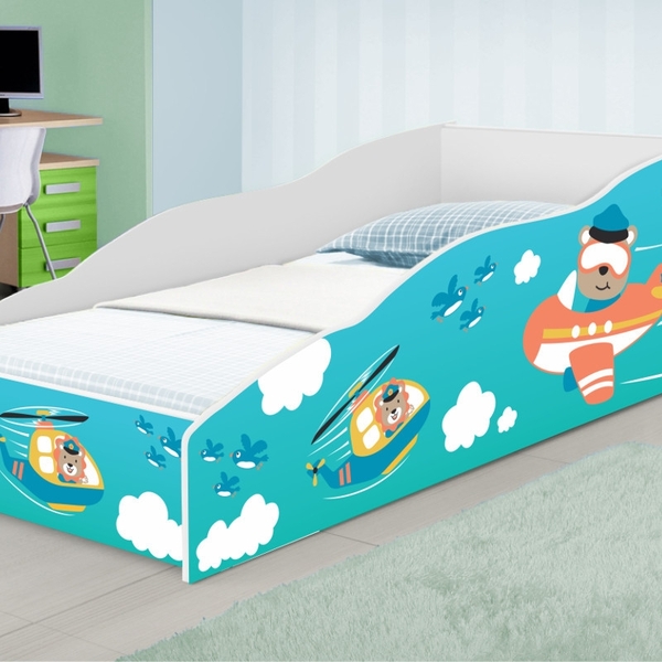 Cama solteiro play aviões a cama, com adesivagem nos painéis, conta com design moderno e direcionado para o conforto, bem-estar e segurança da criança, conferindo um ambiente alegre, colorido e divertido. bordas arredondadas evitando riscos de acidentes, adesivos em vinil d...