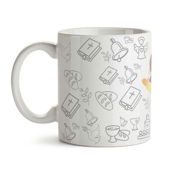 Descriçãoprodutos religiosos - demonstre toda a sua fé seja para você mesmo ou para aquela pessoa que tanto ama! informaçõescapacidade até 320ml resistente a microondas e lava-louças altura: 10cm largura (contando com a alça) 12cm.
