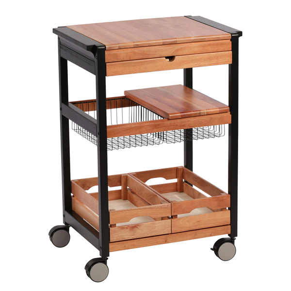 O Carrinho de Apoio Muiracatiara possui um design moderno e elegante, com tonalidades em marrom e preto que se integram facilmente a diversos estilos de ambientes. Ele agrega valor estético ao seu espaço gourmet, tornando-o ainda mais convidativo e agradável.