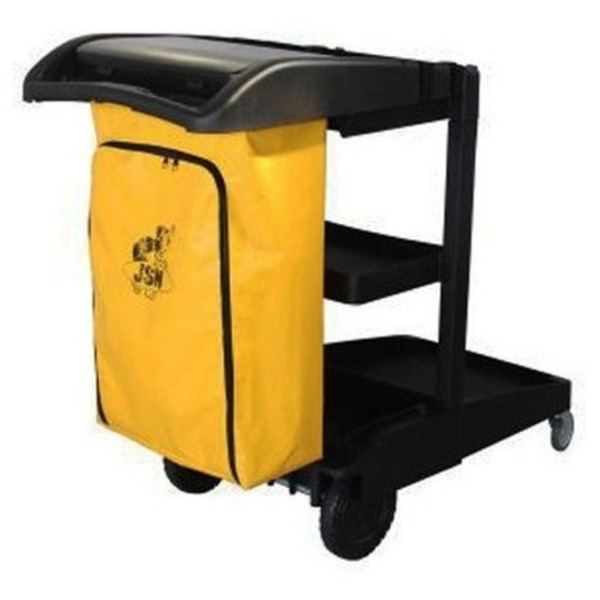 • estrutura injetada em plástico polipropileno. • com 04 rodas, sendo 2 fixas de 8’’ feitas em plástico pvc com um eixo em aço carbono 1020, e 2 rodas giratórias de 2’’ também em plástico pvc. • um saco amarelo em lona com capacidade de 80 litros (sem impressão) com zíper para acomodar o saco de lixo e produtos de limpeza e higiene. • aberturas para encaixe dos acessórios (mops, pás e placas). • prateleiras para transportar armazenar produtos de limpeza ou higiene. • plataforma para apoio do balde espremedor ***(vendidos separadamente ou como conjunto completo, mais informações no campo de perguntas).