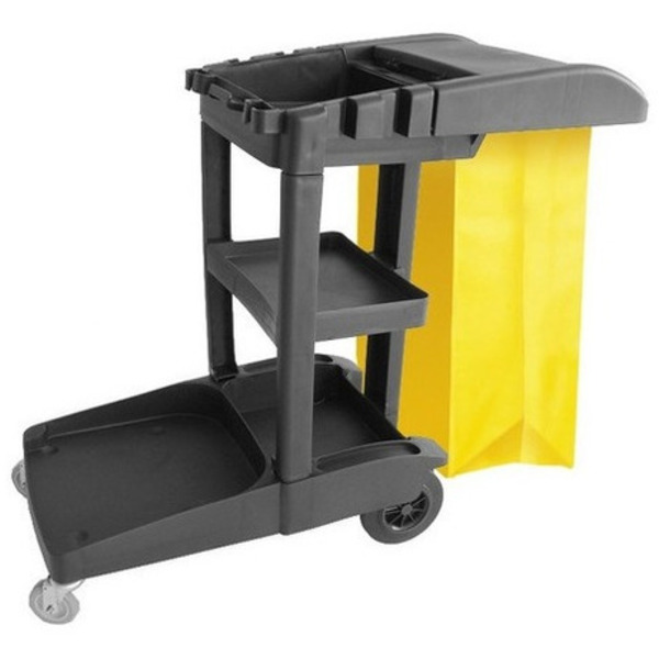 Descrição do produtocarrinho funcional de limpeza.injetado em plástico polipropileno (pp), possui abertura para encaixe dos acessórios (mop, pá e placa), plataforma de apoio para o balde espremedor, proporcionando maior eficiência na elaboração de tarefas, pois tem a função de transportar diversos acessórios de uma só vez.acompanha:- 02 rodas fixas de 8’’- 02 rodas giratórias de 2’’- 01 eixo em aço carbono 1020- 01 saco amarelo em lona com zíper (sem impressão)- estojo no compartimento de encaixe do saco.capacidade: 80l (saco)