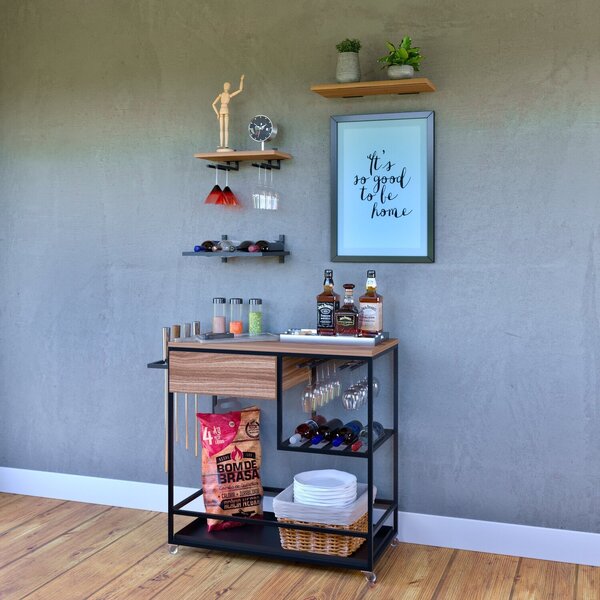 Carrinho gourmet sunday freijo / preto. Em um único móvel funções para bar e para churrasco. o carrinho sunday conta com detalhes exclusivos... a) puxador com telinha; b) gaveta com corrediças para utensílios e talheres; c) porta taças e garrafeiro para 4 garrafas; d) ba...