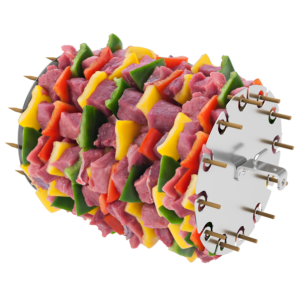 Carrossel inox para 12 espetinhos ideal para fazer aperitivos como coração de frango, salsichão, xixo, cebola, pimentão e pequenos pedaços de carne.detalhes técnicos:fabricado em aço inox, fácil de limpar.utilização de espetinhos de madeiradesmontável para facilitar a limpeza...