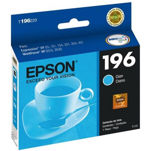 Cartucho epson ciano 4ml - t196220-br tinta durabrite ultra resistente à água, borrões e descoloração. Compatibilidade de impressoras: xp-204/xp-214/xp-401/xp-411. Impressões brilhantes e duráveis. Os cartuchos epson possuem a revolucionária tecnologia de tintas durabrite ult...