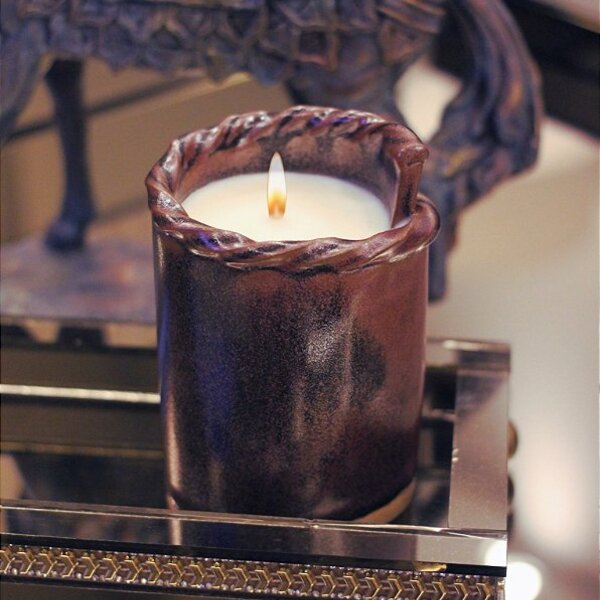 Uma vela que repousa em uma peça de cerâmica com detalhes em espiral, irradiando uma estética vintage que evoca uma sensação de elegância atemporal. O esmalte que cobre a cerâmica é de um tom terroso escuro, oferecendo uma paleta rica e sofisticada. A cerâmica, cuidadosamente...