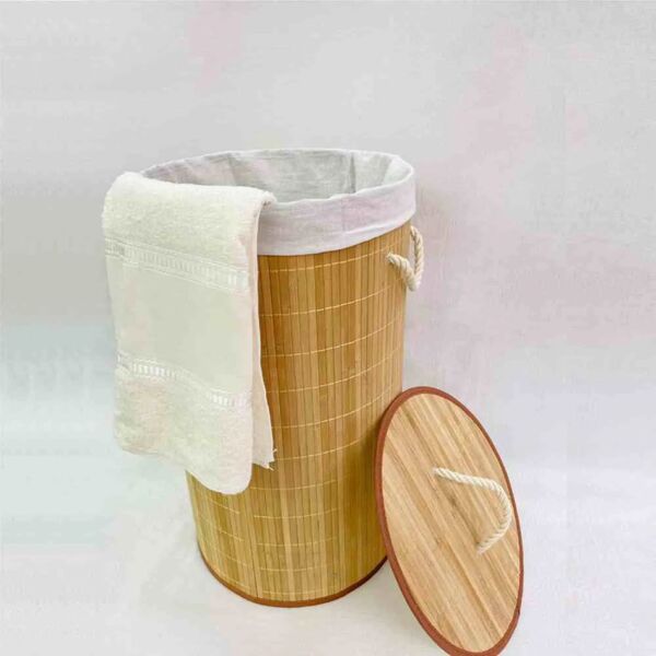 Lindo cesto de bambu com forração interna tampa e alça pratico e funcional ideal para lavanderias e banheiros. peça de decoração para seu banheiro. cesto decorativo e funcional para seu ambiente você pode usar para organizar o cômodo guardar brinquedos roupas ou qualquer item de sua preferência. é um produto ecologicamente correto tendo como sua principal matéria prima o bambu material leve e resistente a mofos e bactérias. ele é desmontável e dobrável com alças facilitando o transporte e armazenamento. Possui tecido interno lavável para agilizar a remoção de roupas sujas. cesto produzido com bambu e tecido. Possui tampa com alça. - não use produtos abrasivos na limpeza. - medidas: 60 altura x 36 diâmetro. contém: 1 cesto de bambu forrado com tampa e alça.