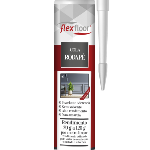 Cola Rodapé Flexfloor Bisnaga 400g CARACTERÍSTICAS A Cola Rodapé é um adesivo a base de copolímeros acrílicos a base de água com consistência pastosa, desenvolvido para colagem de rodapés de madeira, EPS, WPC, MDF, Poliestireno, entre outros tipos de rodapés e molduras com u...