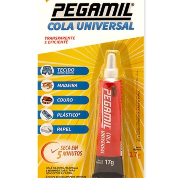 Cola universal pegamil artesanato 17g seca em 5 minutos. Pegamil é um adesivo desenvolvido especialmente para uso em trabalhos manuais, hobbies, artesanatos e reparos em casa, no escritório e na escola. Indicado para colagem de papel, cartão, passamanaria, telas, cartolina, madeira, couro, acrílico, pvc. Rápido e fácil de limpar. Não adere em polietileno, polipropileno e ptfe. Sem tolueno.