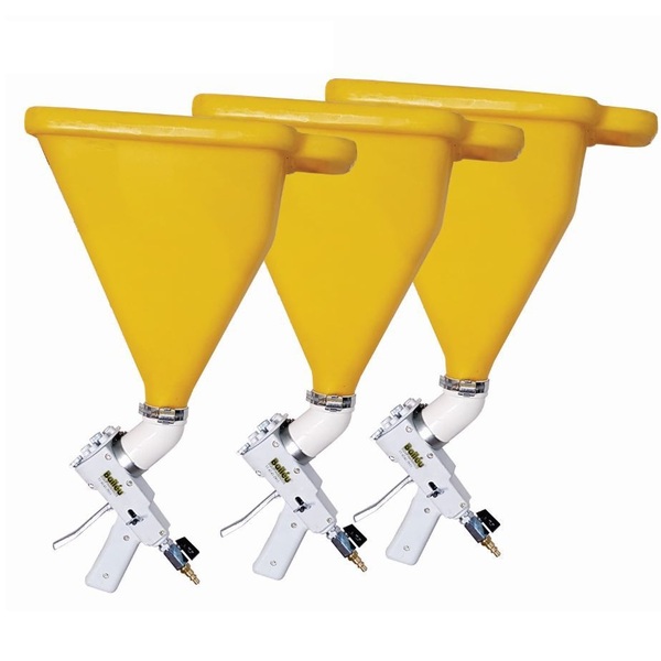 Pistola de projeção utilizada para aplicação de texturas massas finas massa corrida revestimentos acústicos  argamassa revestimentos de mono capa (acabamento chapiscado e travertino) ou outros que possam ser abastecidos por gravidade a base de água. disco de saída com 7 furos de diâmetros diferentes. ferramenta utilizada apenas com compressor a partir de 6 bar peso:1 40 kg cada  conteúdo da embalagem 03 pistola projeção 03 canecas 3 5l 06 abraçadeiras 03 curva