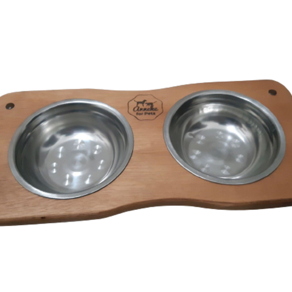 Bebedouro e comedouro elevado duplo para cães e gatos- contribui para postura correta do animal;- produto com design moderno e de fácil higienização;- 2 bowls em inox (removíveis e laváveis);- base em compensado naval (resistente à umidade)- pés em madeira maciça e de ótima q...