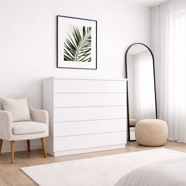 cinco gavetas funcionais: corrediças telescópicas garantem abertura suave e segura, permitindo organizar roupas, acessórios e objetos pessoais com eficiência. Tampo reforçado: o tampo de 25 mm em mdf é ideal para apoiar desde itens decorativos até eletrônicos, com total estabilidade.