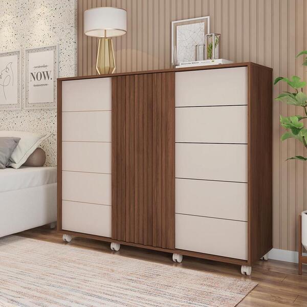 Essa cômoda é perfeita para deixar seu espaço lindo e organizado.produzida em mdp, porta deslizante com acabamento ripado em mdf revestido, porta de giro com frisos em baixo relevo, cabideiro em alumínio, seis repartições internas, cinco gavetas com corrediças telescópicas, p...