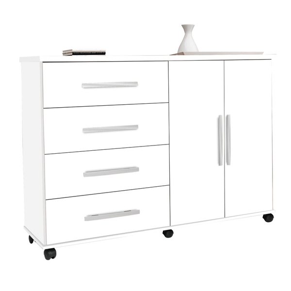 Cômoda bali branco brilho a cômoda bali é ideal para proporcionar um diferencial decorativo para seu ambiente. possui 4 gavetas e 2 portas, tampo mdp de 25mm - corrediças telescópicas - rodizios - base e laterais mdp 15mm - gavetas com travas mdp 12mm - frente gavetas, laterais gavetas e contra fundo gavetas mdp 12mm - portas mdp 12mm - puxador plasticos