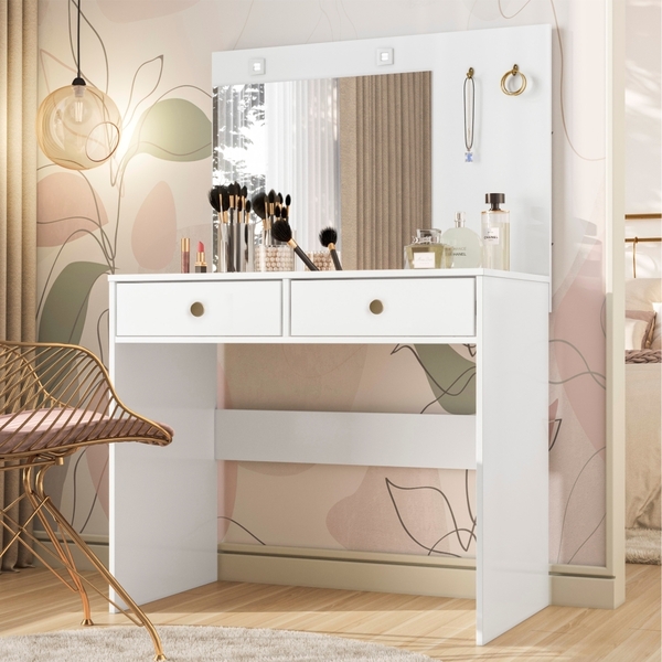 A cômoda penteadeira é ideal para guardar acessórios, maquiagem e demais ítens. detalhes do produto: 2 gavetas corrediças telescópicas 2 luminária de led informações do produto: altura: 137 cm largura: 90 cm comprimento: 52 cm garantia: 3 meses contra defeito de fabricação. itens inclusos: -01 cômoda. -kit completo para montagem, manual detalhado de instruções. informações complementares: - fotos meramente ilustrativas do produto no ambiente. - os objetos que ambientam as fotos não acompanham o produto; - verificar descrição e tamanho do produto antes da compra. - avaliar a mercadoria no ato do recebimento e recusar em caso de divergência ou avarias. - mantenha as informações de contato e endereço de entrega atualizados para entrarmos em contato caso necessário. - limpar com flanela ou pano macio seco, não utilizar produtos abrasivos, desengordurantes, álcool ou solvente. Não expor o produto diretamente à luz solar e à umidade. * sugerimos a contratação de um montador profissional para a montagem do produto. Não nos responsabilizamos por avarias causadas no ato da montagem. * não nos responsabilizamos pela montagem e desmontagem do produto no ato da entrega e devolução, assim como os custos gerados nestas situações. * a transportadora entregará o produto no andar térreo do endereço de entrega. * não nos responsabilizamos por subir escadas, corredores e elevadores ou transporte por guincho em apartamentos.